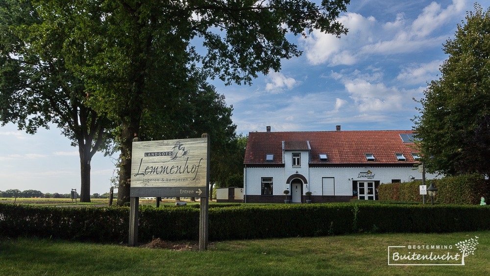 Front view of accommodation n the Limburg landscape with sign and green surroundings.