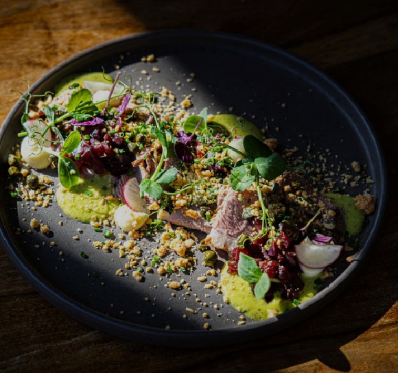 Gerecht tijdens Food La Route Roermond met kleurrijke ingrediënten, groenten en verfijnde opmaak op een bord.