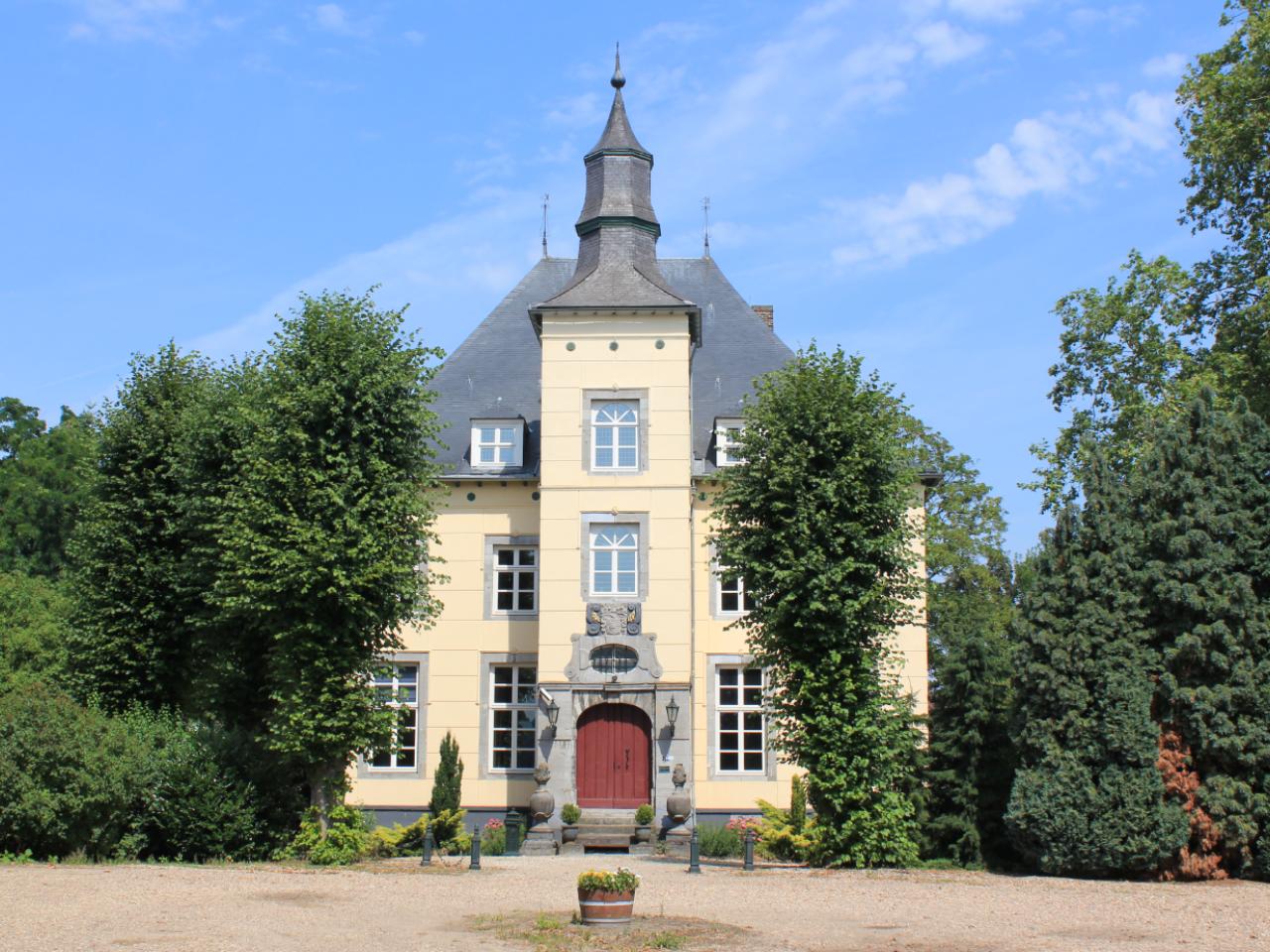 Historisch landhuis met toren en rode voordeur, omgeven door bomen en een oprijlaan in Vlodrop, onderdeel van de gelukswandeling in Vlodrop
