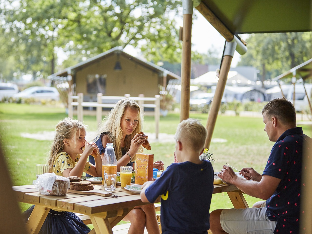 Een gezin ontbijt aan een picknicktafel voor hun glampingtent op camping de Leistert, omringd door zon en groen.