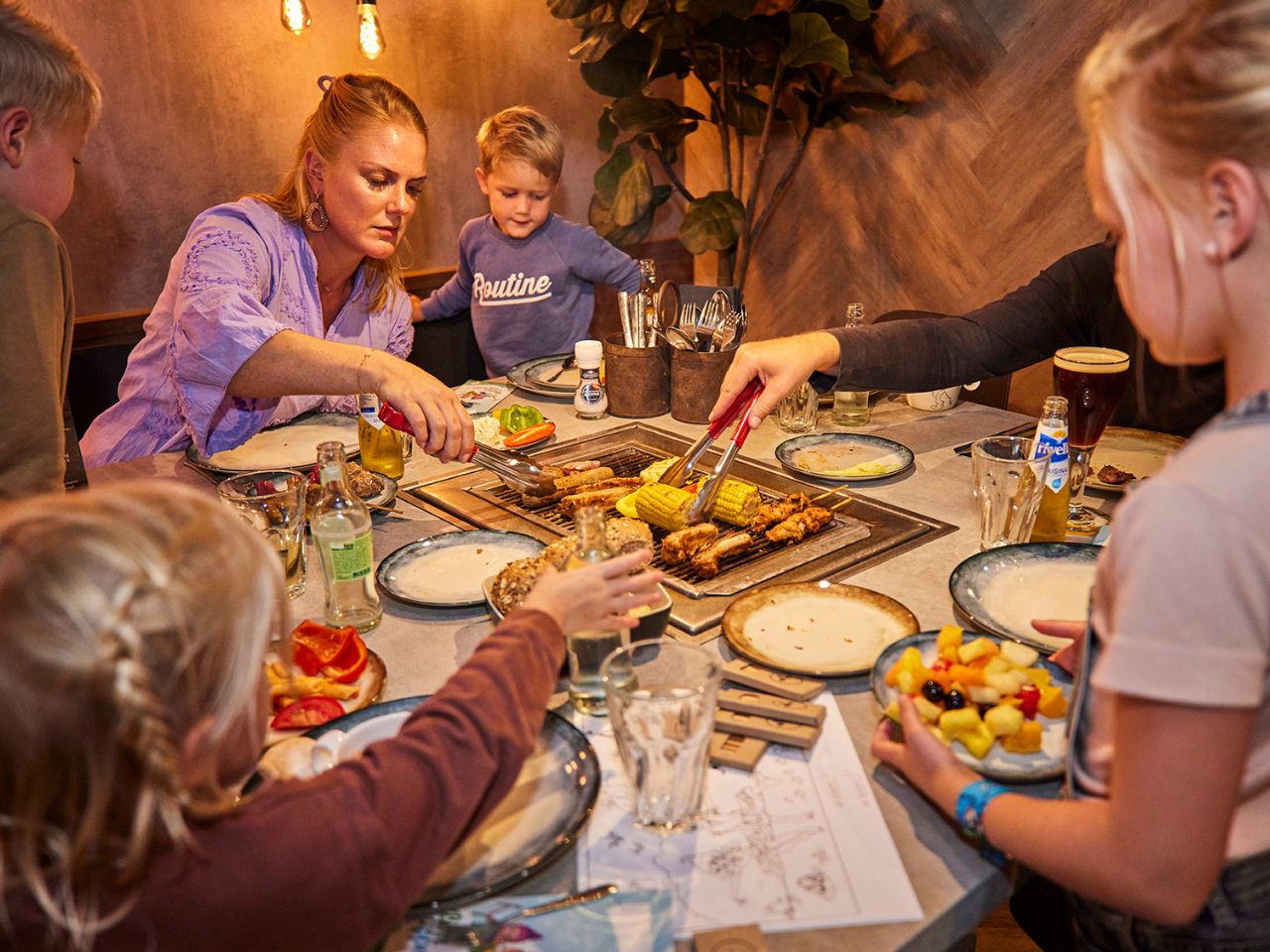 Iedere tafel is voorzien van een ingebouwde tafelgrill. Kies je favoriete vlees, vis of vega hapjes en grill ze zelf aan tafel. Voeg je favoriete garnering toe, laat de kids 'chef for a day' zijn, en een smaakvol en gezellig avondje is gegarandeerd.