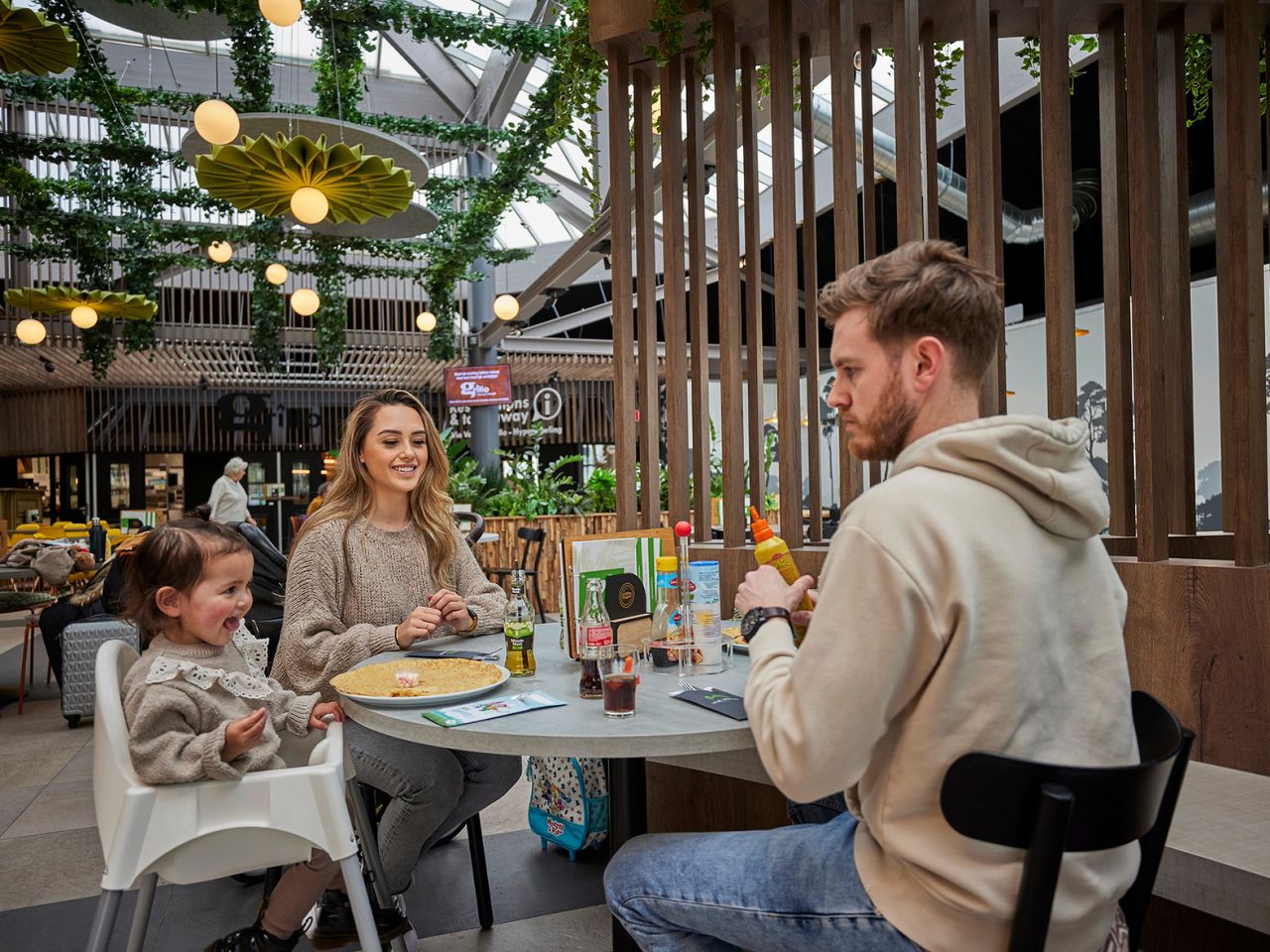 Gezin met jong kind eet samen aan tafel bij restaurant Via Verde  De Leistert.