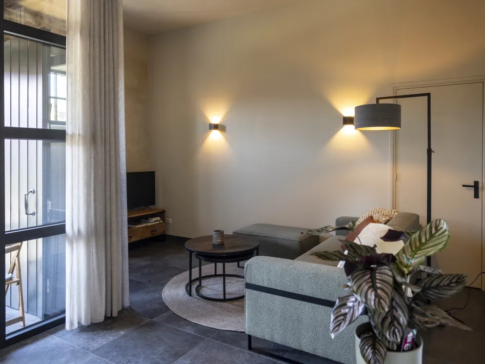 Deze sfeervolle tweepersoonsverblijven combineren stoere leemstuc muren met modern comfort voor een warme uitstraling. Elke woning beschikt over een open leefgedeelte met een knusse zithoek en een luxe keuken, compleet met inductiefornuis en Nespresso apparaat.